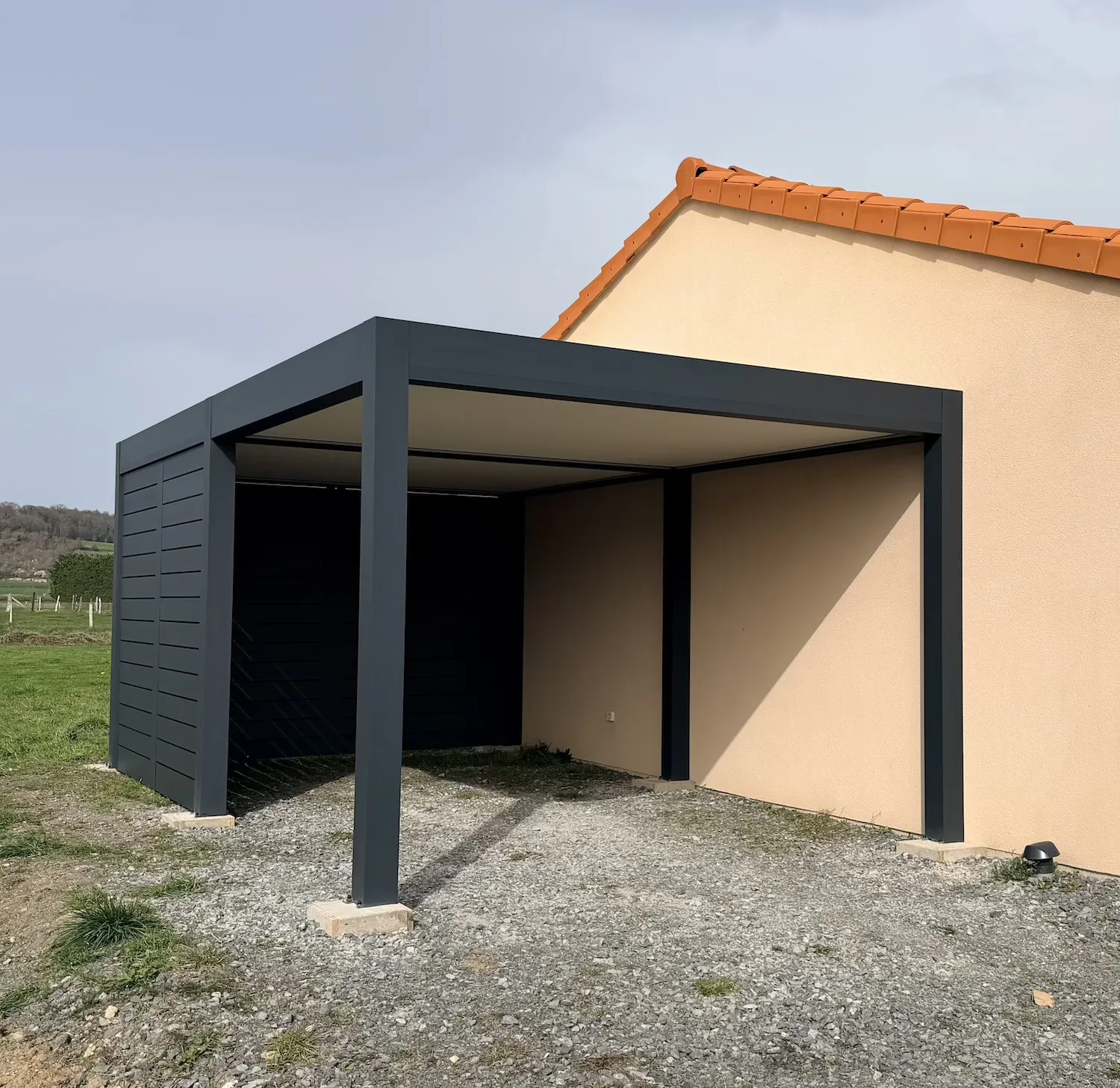 À Aigueperse, Ciel d’Auvergne a réalisé un carport en aluminium sur mesure, conçu pour protéger le véhicule tout en préservant l’esthétique de la maison. Personnalisé avec des brise-vues en persiennes, cet abri voiture allie fonctionnalité, durabilité et élégance.
