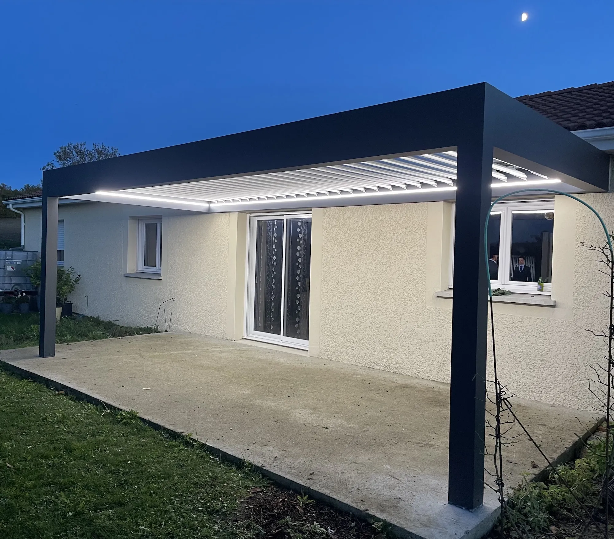 À Bas-et-Lezat, cette pergola bioclimatique en aluminium crée un véritable prolongement de la maison vers l’extérieur. Grâce à ses lames orientables et à son éclairage LED intégré, elle offre confort, protection et convivialité pour profiter pleinement des beaux jours comme des soirées d’été.
